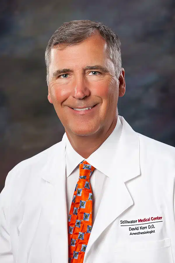 David Kerr DO, DPh, Board Certified by American Board of Anesthesia. He completed his Doctor of Pharmacy degree from University of Oklahoma/HSC, his Doctor of Osteopathic Medicine degree from Oklahoma State College of Osteopathic Medicine and completed his Anesthesia residency at University of Oklahoma/HSC.